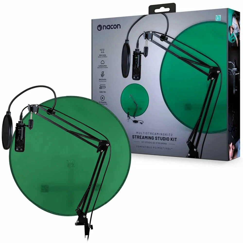 Проводите потоковую передачу с той настройкой, которую вы хотите, с помощью Multi Streaming Kit, который включает в себя микрофон, модульную штангу, подставку и поп-фильтр. Со всеми этими аксессуарами вы можете настроить свою потоковую станцию так, как захотите. Потоковый микрофон: Кардиоидная модель: специально разработана для потоковой передачи голоса Универсальная совместимость: ПК, PS4, PS5 Функция отключения звука и регулировка усиления звука для уменьшения окружающего шума Съемный USB-кабель – Длина: 1,5 м. Регулируемый штатив Защитное ветровое стекло Шарнирно-сочлененная стрела Регулируемая металлическая стрела с поворотом на 360°. Общая длина: 68 см Регулируемый зажим для столов толщиной до 4,5 см. Регулируемый съемный поп-фильтр, который крепится к руке. Складной портативный зеленый экран диаметром 1,08 м Сплошной зеленый цвет, оптимизированный для видеокомпозиции. Липучка для крепления к любому типу стула.